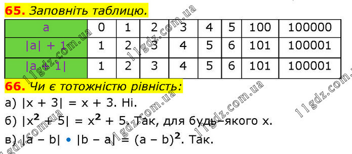 66. Чи є тотожністю рівність: a) |x + 3| = x + 3. Hi. б) |x2 + 5| = x2 + 5. Так, для будь–якого x. в) |а – b| • |b – а| = (а – b)2. Так.