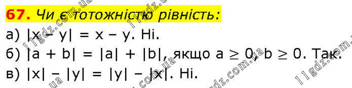 Чи є тотожністю рівність: а) |х – у| = х – у. Ні. б) |а + b| = |а| + |b|, якщо а ≥ 0, b ≥ 0. Так. в) |х| – |у| = |y| – |х|. Ні.