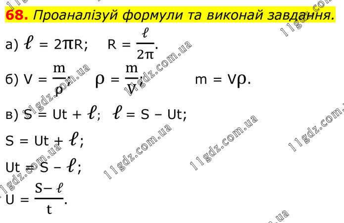 Проаналізуй формули та виконай завдання. a) ℓ = 2πR; R = l/2π. б) V = m/ρ; ρ = m/V; m = Vρ. в) S = Ut + ℓ; ℓ = S – Ut; S = Ut + ℓ; Ut = S – ℓ; U = (S- l)/t.