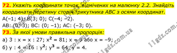 72. Укажіть координати точок, відмічених на малюнку 2.2. Знайдіть координати перетину сторін трикутника АВС з осями координат. A(–1; 4); В(3; 0); С(–4; –2). AB: (0; 3); BC: (0; –1); AC: (–3; 0). 73. За якої умови правильна пропорція: а) 3 : х = х : 27; х2 = 81; х = 9 або х = –9; б) у : 4 = 16 : у2; у3 = 64; у = 4.