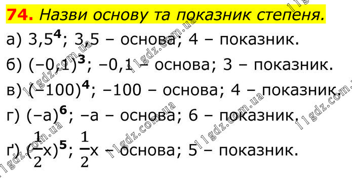 Назви основу та показник степеня. а) 3,54; 3,5 – основа; 4 – показник. б) (–0,1)3; –0,1 – основа; 3 – показник. в) (–100)4; –100 – основа; 4 – показник. г) (–а)6; –а – основа; 6 – показник. ґ) (1/2х)5; 1/2х – основа; 5 – показник.