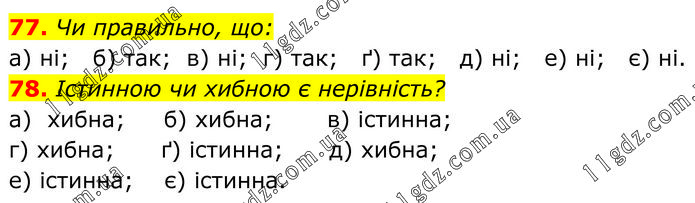 77. Чи правильно, що: а) ні; б) так; в) ні; г) так; ґ) так; д) ні; е) ні; є) ні. 78. Істинною чи хибною є нерівність? а) хибна; б) хибна; в) істинна; г) хибна; ґ) істинна; д) хибна; е) істинна; є) істинна.