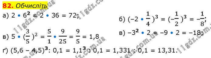 Обчисліть а) 2 • 62 = 2 • 36 = 72; б) (–2 • 1/4 )^3 = (–1/2 )^3 = –1/8; в) 5 • (3/5 )^2 = 5/1 • 9/25 = 9/5 = 1,8 в) –32 • 2 = –9 • 2 = –18; ґ) (5,6 – 4,5)3: 0,1 = 1,13 : 0,1 = 1,331 : 0,1 = 13,31.
