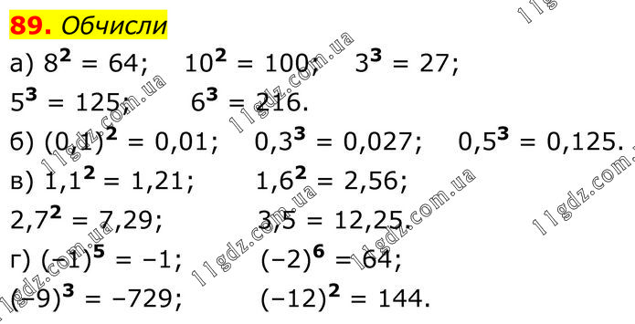 Обчисли а) 82 = 64; 102 = 100; 33 = 27; 53 = 125; 63 = 216. б) (0,1)2 = 0,01; 0,33 = 0,027; 0,53 = 0,125. в) 1,12 = 1,21; 1,62 = 2,56; 2,72 = 7,29; 3,5 = 12,25. г) (–1)5 = –1; (–2)6 = 64; (–9)3 = –729; (–12)2 = 144.