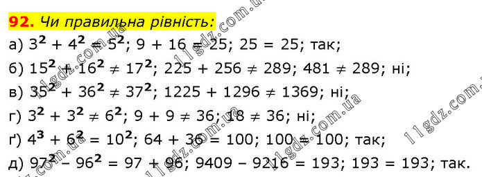 Чи правильна рівність: а) З2 + 42 = 52; 9 + 16 = 25; 25 = 25; так; б) 152 + 162 ≠ 172; 225 + 256 ≠ 289; 481 ≠ 289; ні; в) 352 + 362 ≠ 372; 1225 + 1296 ≠ 1369; ні; г) 32 + 32 ≠ 62; 9 + 9 ≠ 36; 18 ≠ 36; ні; ґ) 43 + 62 = 102; 64 + 36 = 100; 100 = 100; так; д) 972 – 962 = 97 + 96; 9409 – 9216 = 193; 193 = 193; так.