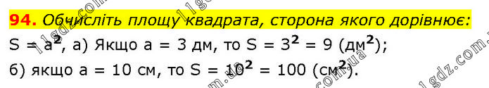 Обчисліть площу квадрата, сторона якого дорівнює: S = а2, а) Якщо а = 3 дм, то S = З2 = 9 (дм2); б) якщо а = 10 см, то S = 102 = 100 (см2).