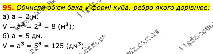 Обчисли об’єм бака у формі куба, ребро якого дорівнює: а) а = 2 м. V = a3 = 23 = 8 (м3); б) а = 5 дм. V = a3 = 53 = 125 (дм3).