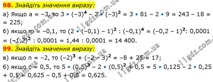 98. Знайдіть значення виразу: а) Якщо а = –3, то 3 • (–3)4 – 2 • (–3)2 = 3 • 81 – 2 • 9 = 243 – 18 = 225; б) якщо m = –0,1, то (2 • (–0,1) – 1)2 : (–0,1)4 = (–0,2 – 1)2 : 0,0001 = (–1,2)2 : 0,0001 = 1,44 : 0,0001 = 14 400. 99. Знайдіть значення виразу: в) якщо n = –2, то (–2)3 + (–2 – З)2 = –8 + 25 = 17; б) якщо с = 0,5, то 5 • (0,5)3 – 2 • (0,5)2 + 0,5 = 5 • 0,125 – 2 • 0,25 + 0,5 = 0,625 – 0,5 + 0,5 = 0,625.