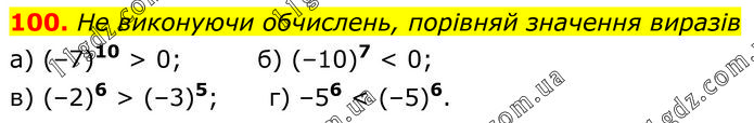 Не виконуючи обчислень, порівняй значення виразів а) (–7)10 > 0; б) (–10)7 < 0; в) (–2)6 > (–3)5; г) –56 < (–5)6.