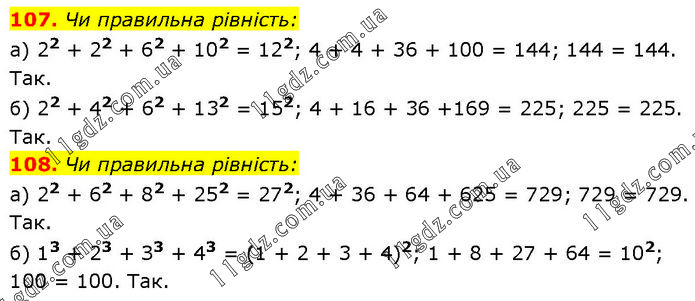 107. Чи правильна рівність: a) 22 + 22 + 62 + 102 = 122; 4 + 4 + 36 + 100 = 144; 144 = 144. Так. б) 22 + 42 + 62 + 132 = 152; 4 + 16 + 36 +169 = 225; 225 = 225. Так. 108. Чи правильна рівність: а) 22 + 62 + 82 + 252 = 272; 4 + 36 + 64 + 625 = 729; 729 = 729. Так. б) 13 + 23 + З3 + 43 = (1 + 2 + 3 + 4)2; 1 + 8 + 27 + 64 = 102; 100 = 100. Так.