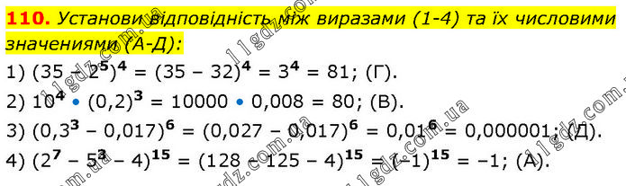 Установи вiдповiднiсть мiж виразами (1-4) та їx числовими значениями (А-Д): 1) (35 – 25)4 = (35 – 32)4 = З4 = 81; (Г). 2) 104 • (0,2)3 = 10000 • 0,008 = 80; (В). 3) (0,33 – 0,017)6 = (0,027 – 0,017)6 = 0,016 = 0,000001; (Д). 4) (27 – 53 – 4)15 = (128 – 125 – 4)15 = (–1)15 = –1; (А).