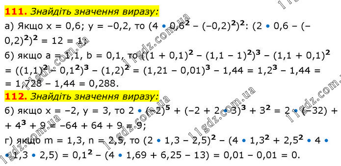 111. Знайдіть значення виразу: а) Якщо х = 0,6; у = –0,2, то (4 • 0,62 – (–0,2)2)2: (2 • 0,6 – (–0,2)2)2 = 12 = 1; б) якщо а = 1,1, b = 0,1, то ((1 + 0,1)2 – (1,1 – 1)2)3 – (1,1 + 0,1)2 = ((1,1)2 – 0,12)3 – (1,2)2 = (1,21 – 0,01)3 – 1,44 = 1,23 – 1,44 = 1,728 – 1,44 = 0,288. 112. Знайдіть значення виразу: б) якщо х = –2, у = 3, то 2 • (–2)5 + (–2 + 2 • З)3 + З2 = 2 • (–32) + 43 + 9 = –64 + 64 + 9 = 9; г) якщо m = 1,3, n = 2,5, то (2 • 1,3 – 2,5)2 – (4 • 1,32 + 2,52 • 4 • 1,3 • 2,5) = 0,12 – (4 • 1,69 + 6,25 – 13) = 0,01 – 0,01 = 0.
