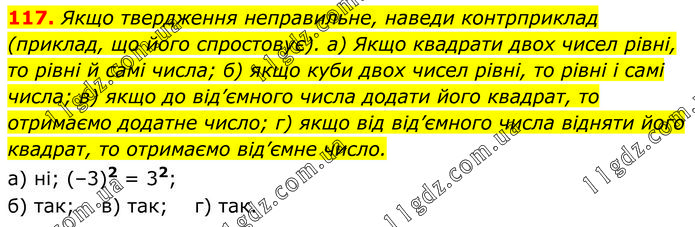 Якщо твердження неправильне, наведи контрприклад (приклад, що його спростовує). а) Якщо квадрати двох чисел рівні, то рівні й самі числа; б) якщо куби двох чисел рівні, то рівні і самі числа; в) якщо до від’ємного числа додати його квадрат, то отримаємо додатне число; г) якщо від від’ємного числа відняти його квадрат, то отримаємо від’ємне число. а) ні; (–3)2 = 32; б) так; в) так; г) так.