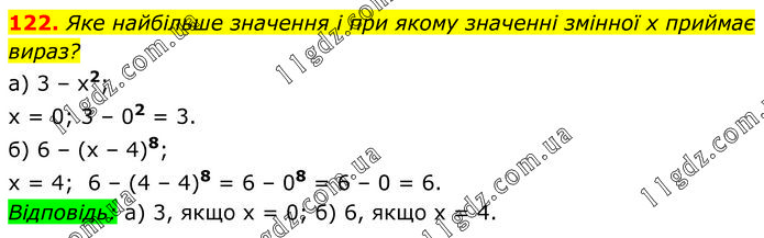 Яке найбільше значення і при якому значенні змінної x приймає вираз? а) 3 – х2; х = 0; 3 – 02 = 3. б) 6 – (х – 4)8; х = 4; 6 – (4 – 4)8 = 6 – 08 = 6 – 0 = 6. Відповідь: а) 3, якщо х = 0; б) 6, якщо х = 4.