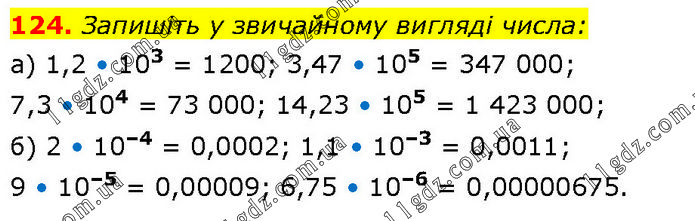 Запишіть у звичайному вигляді числа: а) 1,2 • 103 = 1200; 3,47 • 105 = 347 000; 7,3 • 104 = 73 000; 14,23 • 105 = 1 423 000; б) 2 • 10–4 = 0,0002; 1,1 • 10–3 = 0,0011; 9 • 10–5 = 0,00009; 6,75 • 10–6 = 0,00000675.