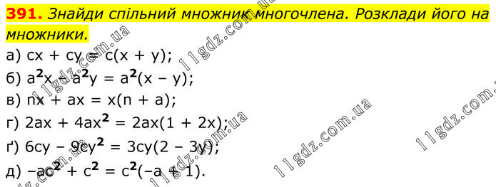 Знайди спільний множник многочлена. Розклади його на множники. а) сх + су = с(х + у); б) а2х – а2у = а2(х – у); в) nx + ax = x(n + a); г) 2ax + 4ax2 = 2ax(1 + 2x); ґ) 6cy – 9cy2 = 3cy(2 – 3y); д) –ac2 + c2 = c2(–a + 1).