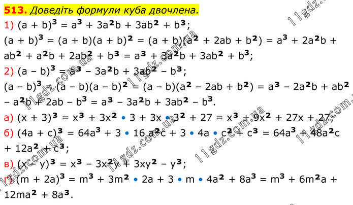 Доведіть формули куба двочлена. 1) (а + b)3 = а3 + 3a²b + 3ab² + b³; (а + b)3 = (а + b)(a + b)² = (a + b)(a² + 2ab + b²) = а3 + 2a²b + ab² + а²b + 2ab² + b³ = a³ + 3a²b + 3ab² + b3; 2) (а – b)3 = а³ – 3а²b + 3ab² – b³; (а – b)3 = (а – b)(a – b)² = (a – b)(a² – 2ab + b²) = а³ – 2a²b + ab² – а²b + 2ab – b3 = a³ – 3a²b + 3ab² – b3. а) (x + 3)³ = x³ + 3x² • 3 + 3х • 3² + 27 = x³ + 9x² + 27x + 27; б) (4a + c)³ = 64а3 + 3 • 16 а²c + 3 • 4а • c² + c³ = 64а3 + 48а²c + 12a² + c³; в) (x – y)³ = x³ – 3x²y + 3xy² – y³; г) (m + 2a)3 = m3 + 3m² • 2a + 3 • m • 4a² + 8a3 = m3 + 6m²а + 12ma² + 8a³.