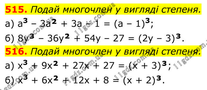 515. Подай многочлен у вигляді степеня. а) а3 – 3а² + 3a – 1 = (a – 1)3; б) 8y³ – 36у² + 54y – 27 = (2y – 3)³. 516. Подай многочлен у вигляді степеня. а) x3 + 9x² + 27x + 27 = (x + 3)³; б) x3 + 6x² + 12x + 8 = (x + 2)³.