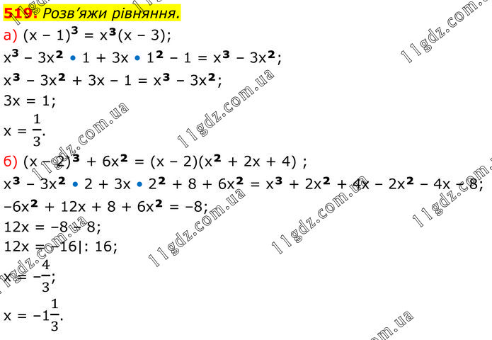 Розв’яжи рівняння. а) (x – 1)3 = x³(x – 3); x3 – 3x² • 1 + 3х • 1² – 1 = x³ – 3x²; x³ – 3x² + 3х – 1 = x³ – 3x²; 3х = 1; x = 1/3. б) (x – 2)³ + 6x² = (x – 2)(x² + 2x + 4) ; x³ – 3x² • 2 + 3х • 2² + 8 + 6x² = x³ + 2x² + 4x – 2x² – 4x – 8; –6x² + 12x + 8 + 6x² = –8; 12x = –8 – 8; 12x = –16|: 16; х = –4/3; х = –11/3.