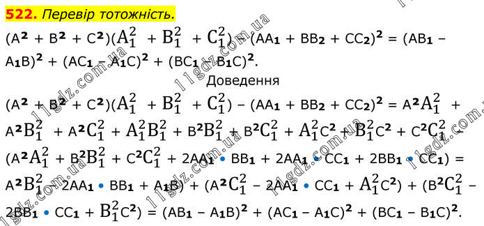 Перевір тотожність. (А² + В² + С²)(А_1^2 + В_1^2 + С_1^2) – (АА1 + ВВ2 + СС2)2 = (АВ1 – А1В)2 + (АС1 – А1С)2 + (ВС1 – В1С)2. Доведення (А² + В² + С²)(А_1^2 + В_1^2 + С_1^2) – (АА1 + ВВ2 + СС2)2 = А²А_1^2 + А²В_1^2 + А²С_1^2 + А_1^2 В_1^2 + В2В_1^2 + В2С_1^2 + А_1^2С2 + В_1^2С2 + С2С_1^2 – (А²А_1^2 + В2В_1^2 + С2С_1^2 + 2АА1 • ВВ1 + 2АА1 • СС1 + 2ВВ1 • СС1) = А²В_1^2 – 2АА1 • ВВ1 + А1В) + (А²С_1^2 – 2АА1 • СС1 + А_1^2С2) + (В2С_1^2 – 2ВВ1 • СС1 + В_1^2С2) = (АВ1 – А1В)2 + (АС1 – А1С)2 + (ВС1 – В1С)2.
