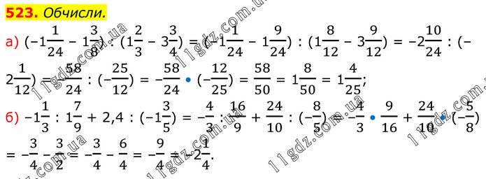 Обчисли. а) (–11/24 – 13/8) : (12/3 – 33/4) = (–11/24 – 19/24) : (18/12 – 39/12) = –210/24 : (–21/12) = –58/24 : (–25/12) = –58/24 • (–12/25) = 58/50 = 18/50 = 14/25; б) –11/3 : 17/9 + 2,4 : (–13/5) = –4/3 : 16/9 + 24/10 : (–8/5) = –4/3 • 9/16 + 24/10 • (–5/8) = –3/4 – 3/2 = –3/4 – 6/4 = –9/4 = –21/4.