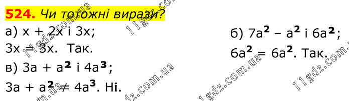 Чи тотожні вирази? а) x + 2x і 3х; 3х = 3х. Так. в) 3а + а² і 4а³; 3а + а² ≠ 4a3. Ні. б) 7а2 – а2 і 6a²; 6а2 = 6а2. Так.