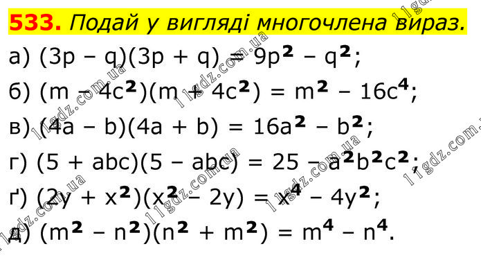 Подай у вигляді многочлена вираз. а) (3р – q)(3р + q) = 9p² – q²; б) (m – 4c²)(m + 4c²) = m² – 16c4; в) (4а – b)(4a + b) = 16а² – b²; г) (5 + abc)(5 – abc) = 25 – а²b²c²; ґ) (2y + x²)(x² – 2y) = x4 – 4y²; д) (m² – n²)(n² + m²) = m4 – n4.