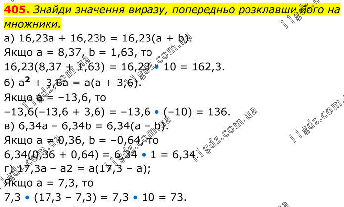Знайди значення виразу, попередньо розклавши його на множники. a) 16,23a + 16,23b = 16,23(a + b). Якщо а = 8,37, b = 1,63, то 16,23(8,37 + 1,63) = 16,23 • 10 = 162,3. б) a2 + 3,6a = a(a + 3,6). Якщо а = –13,6, то –13,6(–13,6 + 3,6) = –13,6 • (–10) = 136. в) 6,34a – 6,34b = 6,34(a – b). Якщо a = 0,36, b = –0,64, то 6,34(0,36 + 0,64) = 6,34 • 1 = 6,34. г) 17,3а – а2 = а(17,3 – а); Якщо а = 7,3, то 7,3 • (17,3 – 7,3) = 7,3 • 10 = 73.