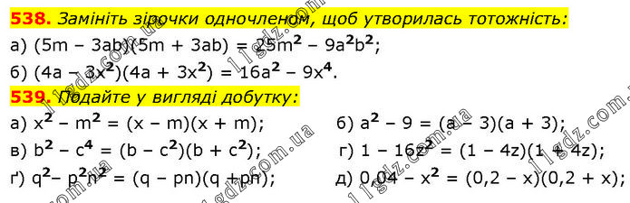 538. Замініть зірочки одночленом, щоб утворилась тотожність: a) (5m – 3ab)(5m + 3ab) = 25m2 – 9a2b2; б) (4a – 3x2)(4a + 3x2) = 16a2 – 9x4. 539. Подайте у вигляді добутку: a) x2 – m2 = (x – m)(x + m); б) a2 – 9 = (a – 3)(a + 3); в) b2 – c4 = (b – c2)(b + c2); г) 1 – 16z2 = (1 – 4z)(1 + 4z); ґ) q2– p2n2 = (q – pn)(q +pn); д) 0,04 – x2 = (0,2 – x)(0,2 + x);