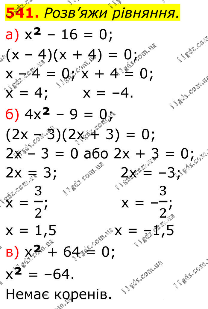 Розв’яжи рівняння. а) x² – 16 = 0; (x – 4)(x + 4) = 0; x – 4 = 0; x + 4 = 0; x = 4; x = –4. б) 4x² – 9 = 0; (2x – 3)(2x + 3) = 0; 2x – 3 = 0 або 2x + 3 = 0; 2x = 3; 2x = –3; x = 3/2; x = –3/2; x = 1,5 x = –1,5 в) x² + 64 = 0; x² = –64. Немає коренів.
