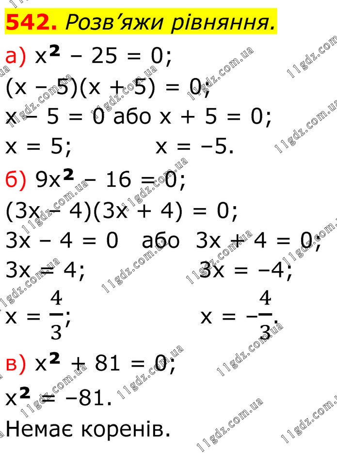 Розв’яжи рівняння. а) x² – 25 = 0; (x – 5)(x + 5) = 0; x – 5 = 0 або x + 5 = 0; x = 5; x = –5. б) 9x² – 16 = 0; (3х – 4)(3х + 4) = 0; 3х – 4 = 0 або 3х + 4 = 0; 3х = 4; 3х = –4; x = 4/3; x = –4/3. в) x² + 81 = 0; x² = –81. Немає коренів.