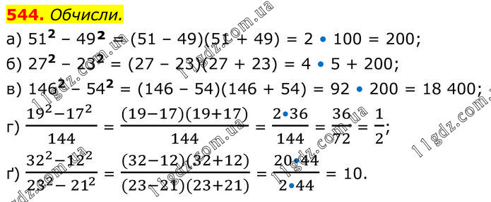 Обчисли. а) 512 – 49² = (51 – 49)(51 + 49) = 2 • 100 = 200; б) 272 – 232 = (27 – 23)(27 + 23) = 4 • 5 + 200; в) 1462 – 542 = (146 – 54)(146 + 54) = 92 • 200 = 18 400; г) (19^2-17^2 )/144 = ((19-17)(19+17))/144 = (2•36)/144 = 36/72 = 1/2; ґ) (32^2-12^2 )/(23^2- 21^2 ) = ((32-12)(32+12))/((23-21)(23+21)) = (20•44)/(2•44) = 10.