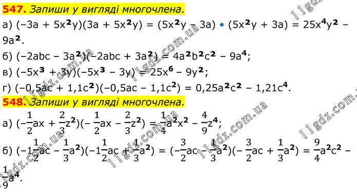 547. Запиши у вигляді многочлена. а) (–3а + 5x²y)(3a + 5x²y) = (5x²y – 3а) • (5x²y + 3a) = 25x4y² – 9a². б) (–2abc – 3а²)(–2abc + 3a²) = 4a²b²c² – 9а4; в) (–5x³ + 3y)(–5x³ – 3y) = 25x6 – 9y²; г) (–0,5ас + 1,1с²)(–0,5ас – 1,1с2) = 0,25a²c² – 1,21с4. 548. Запиши у вигляді многочлена. а) (–1/2ах + 2/3z2)(– 1/2ax – 2/3z2) = 1/4a2x2 – 4/9z4; б) (–11/2ac – 1/3a2)(–11/2ac + 1/3a2) = (–3/2ac – 1/3a2)(– 3/2ac + 1/3a2) = 9/4a2c2 – 1/9a4.