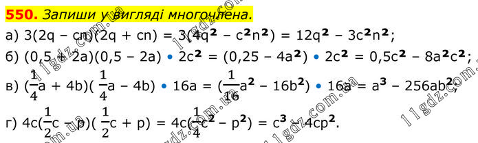 Запиши у вигляді многочлена. а) 3(2q – cn)(2q + cn) = 3(4q² – c²n²) = 12q² – 3c²n²; б) (0,5 + 2а)(0,5 – 2а) • 2c² = (0,25 – 4а²) • 2c² = 0,5c² – 8а²c²; в) (1/4а + 4b)( 1/4a – 4b) • 16a = (1/16a2 – 16b2) • 16a = а3 – 256ab2; г) 4с(1/2с – р)( 1/2с + р) = 4с(1/4с2 – р2) = с3 – 4ср2.