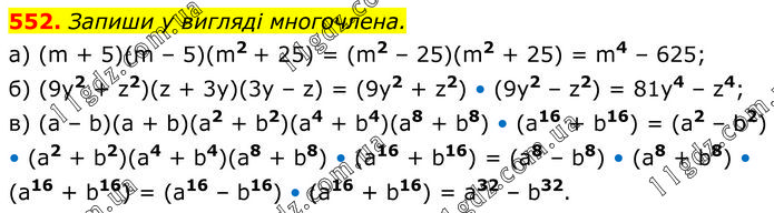 Запиши у вигляді многочлена. a) (m + 5)(m – 5)(m2 + 25) = (m2 – 25)(m2 + 25) = m4 – 625; б) (9y2 + z2)(z + 3y)(3y – z) = (9y2 + z2) • (9y2 – z2) = 81y4 – z4; в) (a – b)(a + b)(a2 + b2)(a4 + b4)(a8 + b8) • (a16 + b16) = (a2 – b2) • (a2 + b2)(a4 + b4)(a8 + b8) • (a16 + b16) = (a8 – b8) • (a8 + b8) • (a16 + b16) = (a16 – b16) • (a16 + b16) = a32 – b32.