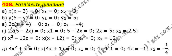 Розв’яжіть рівняння а) x(x – 3) = 0; x1 = 0; x2 = 3; б) y(5 – y) = 0; y1 = 0; y2 = 5; в) 3z(z + 4) = 0; z1 = 0; z2 = –4; г) 2x(5 – 2х) = 0; x1 = 0; 5 – 2х = 0; 2х = 5; x2 = 2,5; ґ) x2 – 12z = 0; х(х – 12) = 0; x1 = 0; x2 = 12; д) 4x2 + х = 0; х(4х + 1) = 0; x1 = 0; 4х + 1 = 0; 4х = –1; х2 = –1/4.