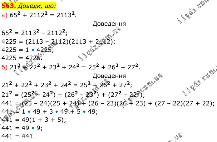 Доведи, що: а) 652 + 21122 = 21132. Доведення 652 = 21132 – 21122; 4225 = (2113 – 2112)(2113 + 2112); 4225 = 1 • 4225; 4225 = 4225. б) 212 + 222 + 232 + 242 = 252 + 262 + 272. Доведення 212 + 222 + 232 + 242 = 252 + 262 + 272; 212 = (252 – 242) + (262 – 232) + (272 – 222); 441 = (25 – 24)(25 + 24) + (26 – 23)(26 + 23) + (27 – 22)(27 + 22); 441 = 1 • 49 + 3 • 49 + 5 • 49; 441 = 49(1 + 3 + 5); 441 = 49 • 9; 441 = 441.
