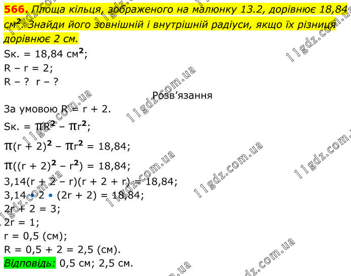 Площа кільця, зображеного на малюнку 13.2, дорівнює 18,84 см2. Знайди його зовнішній і внутрішній радіуси, якщо їх різниця дорівнює 2 см. Sк. = 18,84 см2; R – r = 2; R – ? r – ? Розв’язання За умовою R = r + 2. Sк. = πR2 – πr2; π(r + 2)2 – πr2 = 18,84; π((r + 2)2 – r2) = 18,84; 3,14(r + 2 – r)(r + 2 + r) = 18,84; 3,14 • 2 • (2r + 2) = 18,84; 2r + 2 = 3; 2r = 1; r = 0,5 (см); R = 0,5 + 2 = 2,5 (см). Відповідь: 0,5 см; 2,5 см.