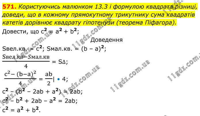 Користуючись малюнком 13.3 і формулою квадрата різниці, доведи, що в кожному прямокутному трикутнику сума квадратів катетів дорівнює квадрату гіпотенузи (теорема Піфагора). Довести, що c2 = a2 + b2; Доведення Sвел.кв. = с2; Sмал.кв. = (b – a)2; (Sвел.кв-Sмал.кв)/4 = S∆; (c^2- (b-a)^2)/4 = ab/2| • 4; c2 – (b2 – 2ab + a2) = 2ab; c2 – b2 + 2ab – a2 = 2ab; c2 = a2 + b2.