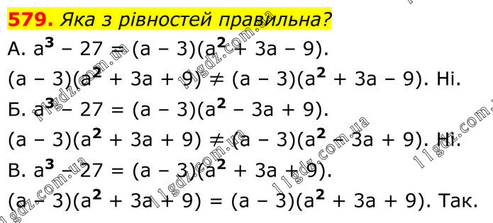 Яка з рівностей правильна? A. a3 – 27 = (a – 3)(a2 + 3a – 9). (a – 3)(a2 + 3a + 9) ≠ (a – 3)(a2 + 3a – 9). Ні. Б. а3 – 27 = (а – 3)(а2 – 3а + 9). (а – 3)(а2 + 3а + 9) ≠ (а – 3)(а2 – 3а + 9). Ні. В. а3 – 27 = (а – 3)(а2 + 3а + 9). (а – 3)(а2 + 3а + 9) = (а – 3)(а2 + 3а + 9). Так.