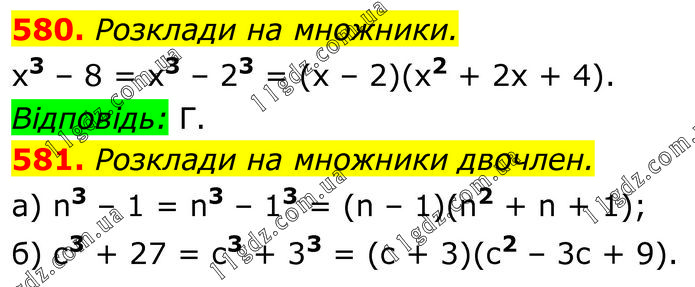 580. Розклади на множники. х3 – 8 = х3 – 23 = (х – 2)(х2 + 2х + 4). Відповідь: Г. 581. Розклади на множники двочлен. a) n3 – 1 = n3 – 13 = (n – 1)(n2 + n + 1); б) с3 + 27 = с3 + 33 = (с + 3)(с2 – 3с + 9).