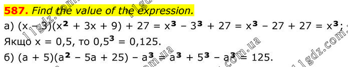 Find the value of the expression. а) (x – 3)(x² + 3х + 9) + 27 = x³ – 3³ + 27 = x³ – 27 + 27 = x³; Якщо x = 0,5, то 0,53 = 0,125. б) (а + 5)(а² – 5а + 25) – а³ = а³ + 5³ – а³ = 125.