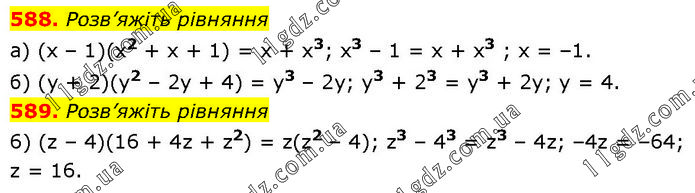 588. Розв’яжіть рівняння а) (x – 1)(x2 + x + 1) = x + x3; x3 – 1 = х + x3 ; х = –1. б) (у + 2)(y2 – 2у + 4) = y3 – 2у; y3 + 23 = у3 + 2у; у = 4. 589. Розв’яжіть рівняння 6) (z – 4)(16 + 4z + z2) = z(z2 – 4); z3 – 43 = z3 – 4z; –4z = –64; z = 16.