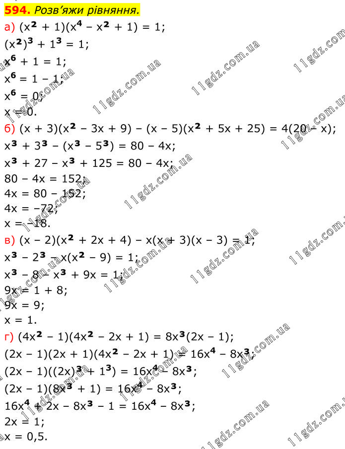 Розв’яжи рівняння. а) (x² + 1)(x4 – x² + 1) = 1; (x²)3 + 13 = 1; x6 + 1 = 1; x6 = 1 – 1; x6 = 0; x = 0. б) (x + 3)(x² – 3х + 9) – (x – 5)(x² + 5x + 25) = 4(20 – x); x³ + 3³ – (x³ – 5³) = 80 – 4x; x³ + 27 – x³ + 125 = 80 – 4x; 80 – 4x = 152; 4x = 80 – 152; 4x = –72; x = –18. в) (x – 2)(x² + 2x + 4) – x(х + 3)(х – 3) = 1; x³ – 2³ – x(x² – 9) = 1; x³ – 8 – x³ + 9x = 1; 9x = 1 + 8; 9x = 9; x = 1. г) (4x² – 1)(4x² – 2x + 1) = 8x³(2x – 1); (2x – 1)(2x + 1)(4x² – 2x + 1) = 16x4 – 8x³; (2x – 1)((2x)³ + 13) = 16x4 – 8x³; (2x – 1)(8x³ + 1) = 16x4 – 8x³; 16x4 + 2х – 8x³ – 1 = 16x4 – 8x³; 2x = 1; x = 0,5.