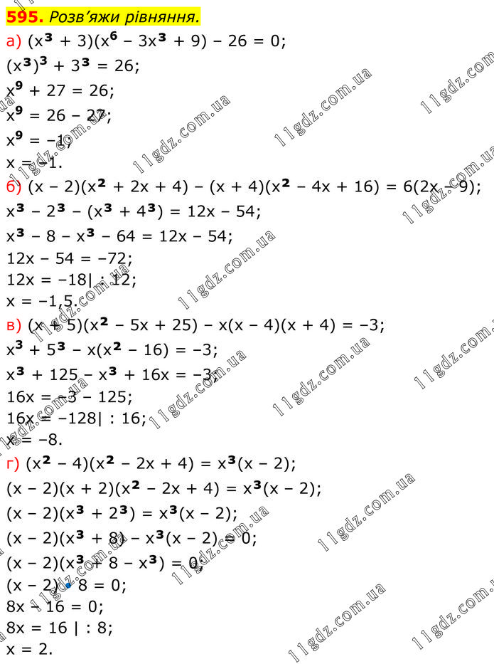 Розв’яжи рівняння. а) (x³ + 3)(х6 – 3x³ + 9) – 26 = 0; (x³)3 + 3³ = 26; x9 + 27 = 26; x9 = 26 – 27; x9 = –1; x = –1. б) (x – 2)(x² + 2x + 4) – (x + 4)(x² – 4x + 16) = 6(2x – 9); x³ – 2³ – (x³ + 4³) = 12x – 54; x³ – 8 – x³ – 64 = 12x – 54; 12x – 54 = –72; 12x = –18| : 12; x = –1,5. в) (x + 5)(x² – 5x + 25) – x(х – 4)(x + 4) = –3; x3 + 5³ – x(x² – 16) = –3; x³ + 125 – x³ + 16x = –3; 16х = –3 – 125; 16х = –128| : 16; x = –8. г) (x² – 4)(x² – 2x + 4) = x³(x – 2); (x – 2)(x + 2)(x² – 2x + 4) = x³(x – 2); (x – 2)(x³ + 2³) = x³(x – 2); (x – 2)(x³ + 8) – x³(x – 2) = 0; (x – 2)(x³ + 8 – x³) = 0; (x – 2) • 8 = 0; 8х – 16 = 0; 8х = 16 | : 8; x = 2.