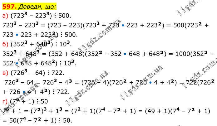 Доведи, що: а) (7233 – 2233) ⋮ 500. 7233 – 2233 = (723 – 223)(7232 + 723 • 223 + 223²) = 500(723² + 723 • 223 + 223²) ⋮ 500. б) (3523 + 6483) ⋮ 103. 3523 + 6483 = (352 + 648)(352² – 352 • 648 + 648²) = 1000(352² – 352 • 648 + 6482) ⋮ 103. в) (7263 – 64) ⋮ 722. 7263 – 64 = 7263 – 4³ = (726 – 4)(726² + 726 • 4 + 4²) = 722(726² + 726 • 4 + 4²) ⋮ 722. г) (76 + 1) ⋮ 50 76 + 1 = (7²)3 + 13 = (72 + 1)(74 – 7² + 1) = (49 + 1)(74 – 7² + 1) = 50(74 – 7² + 1) ⋮ 50.
