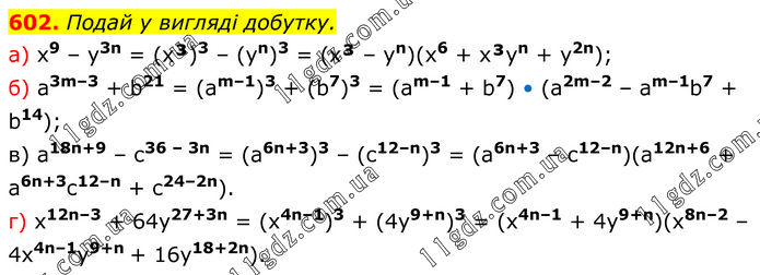 Подай у вигляді добутку. а) x9 – y3n = (x³)3 – (yn)3 = (x³ – yn)(x6 + x³yn + y2n); б) а3m–3 + b21 = (am–1)3 + (b7)3 = (am–1 + b7) • (а2m–2 – am–1b7 + b14); в) а18n+9 – с36 – 3n = (a6n+3)3 – (с12–n)3 = (а6n+3 – с12–n)(а12n+6 + а6n+3c12–n + c24–2n). г) x12n–3 + 64y27+3n = (x4n–1)3 + (4y9+n)3 = (x4n–1 + 4y9+n)(x8n–2 – 4x4n–1y9+n + 16y18+2n).
