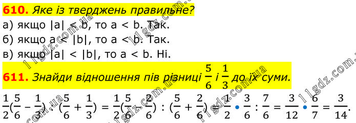 610. Яке із тверджень правильне? а) якщо |a| < b, то a < b. Так. б) якщо a < |b|, то a < b. Так. в) якщо |a| < |b|, то a < b. Ні. 611. Знайди відношення пів різниці 5/6 і 1/3 до їх суми. 1/2(5/6 – 1/3) : (5/6 + 1/3) = 1/2(5/6 – 2/6) : (5/6 + 2/6) = 1/2 • 3/6 : 7/6 = 3/12 • 6/7 = 3/14.