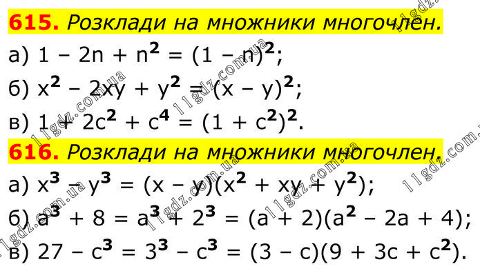 615. Розклади на множники многочлен. a) 1 – 2n + n2 = (1 – n)2; б) x2 – 2xy + y2 = (x – y)2; в) 1 + 2c2 + c4 = (1 + c2)2. 616. Розклади на множники многочлен. a) x3 – y3 = (x – y)(x2 + xy + y2); б) a3 + 8 = a3 + 23 = (a + 2)(a2 – 2a + 4); в) 27 – c3 = 33 – c3 = (3 – c)(9 + 3c + c2).