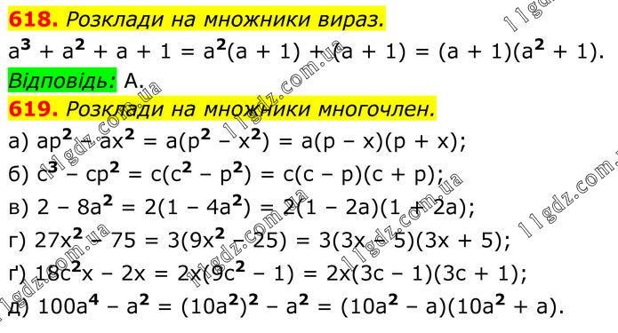 618. Розклади на множники вираз. a3 + a2 + a + 1 = a2(a + 1) + (a + 1) = (a + 1)(a2 + 1). Відповідь: А. 619. Розклади на множники многочлен. a) ap2 – ax2 = a(p2 – x2) = a(p – x)(p + x); б) c3 – cp2 = c(c2 – p2) = c(c – p)(c + p); в) 2 – 8a2 = 2(1 – 4a2) = 2(1 – 2a)(1 + 2a); г) 27x2 – 75 = 3(9x2 – 25) = 3(3x – 5)(3x + 5); ґ) 18c2x – 2x = 2x(9c2 – 1) = 2x(3c – 1)(3c + 1); д) 100a4 – a2 = (10a2)2 – a2 = (10a2 – a)(10a2 + a).